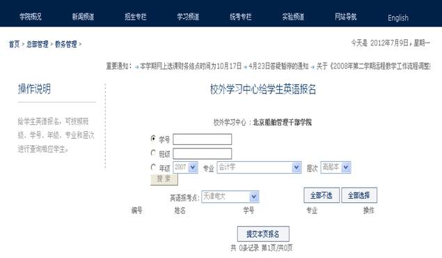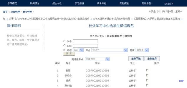 第一步:通过学号,班级,年级,专业,层次等信息对本学习中心符合条件的学生进行搜索(如图4所示)。