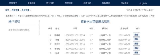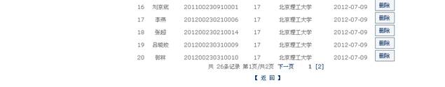 点击如图3所示页面上的“查看三级英语报名信息”,显示如图6所示页面,该页面将显示出本学习中心全部提交报名的学生名单。选中复选框后按【删除】按钮,将删除被选中该学生报名记录。点击【下一页】链接,显示下一页搜索内容。点击第1,2页链接,显示第1,2页搜索内容。